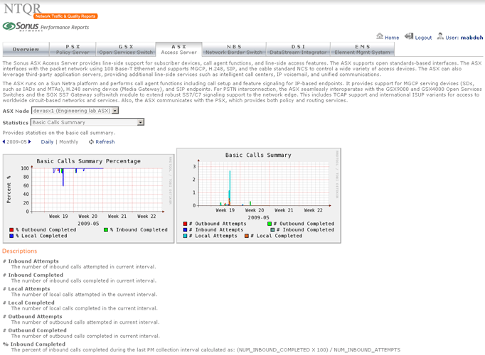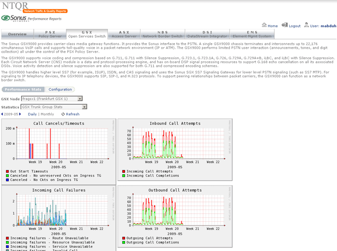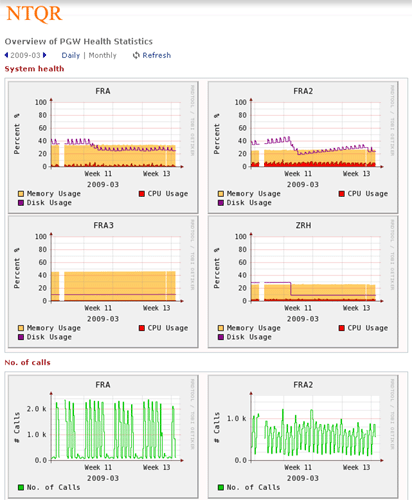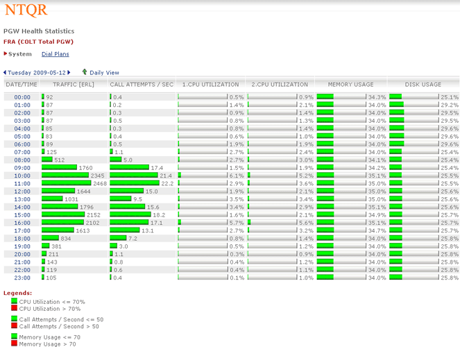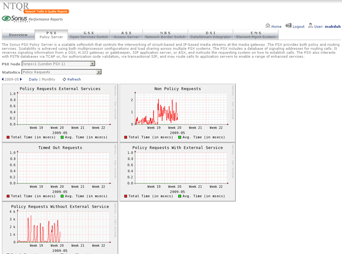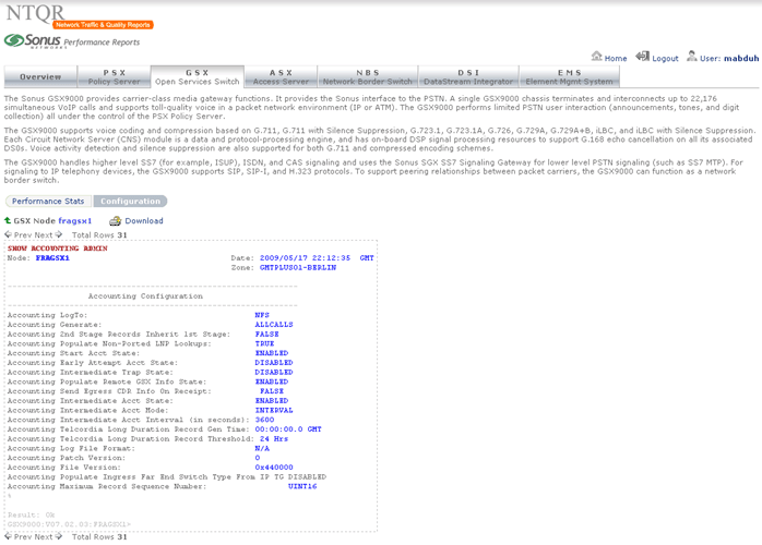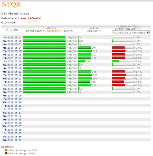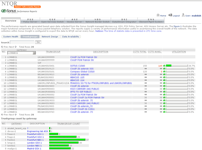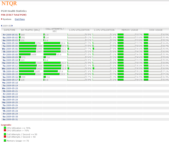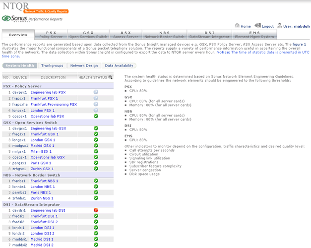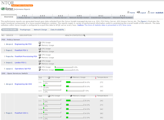 Sonus provides performance statistics about their network devices. Retrieving the needed statistics using Sonus GUI however is not without effort. NTQR users get indulged with the easy use of NTQR web portal...:-) For that reason the module for Sonus performance analysis has been implemented in NTQR. Users can now easily find the aggregated and analyzed statistics they need. Relevant metrics are monitored according to Sonus Network Element Engineering Guidelines which defines the threshold values for resource usage of Sonus devices.