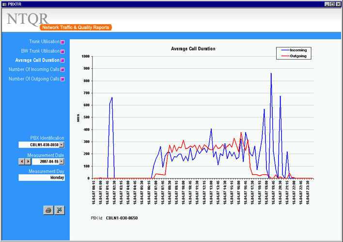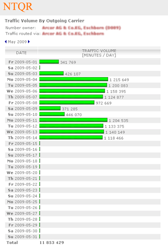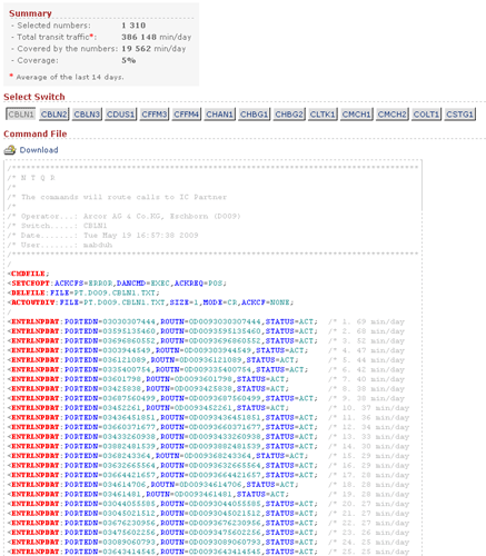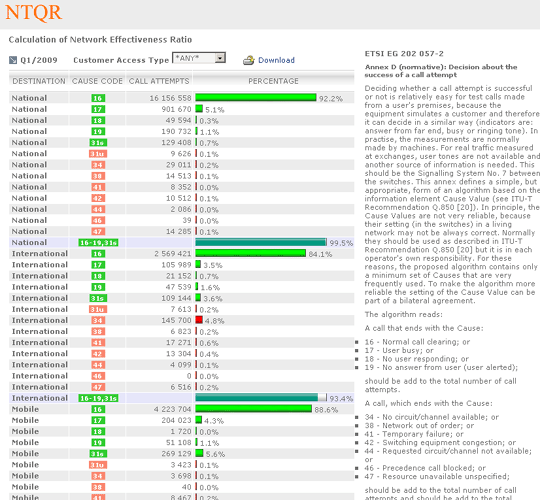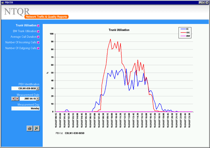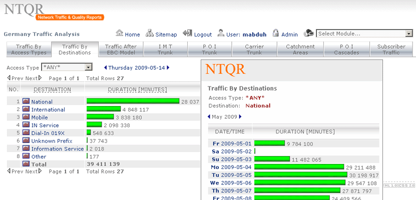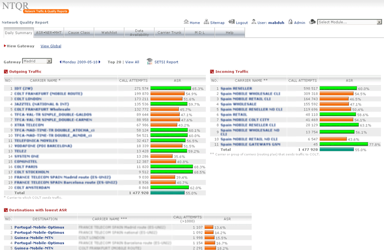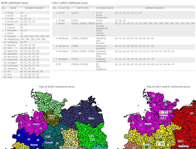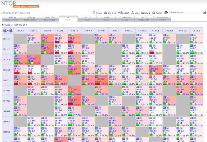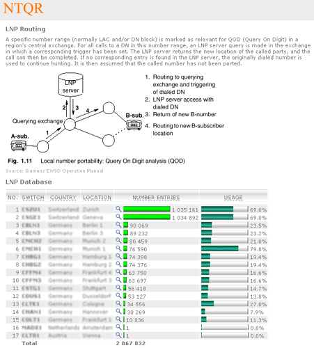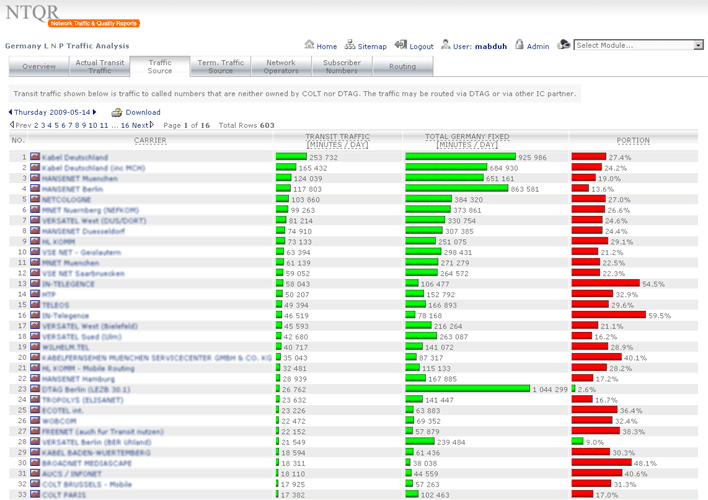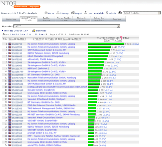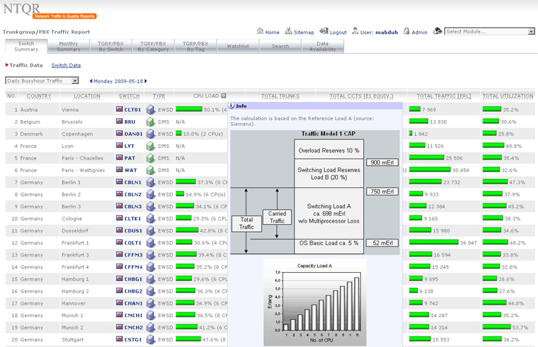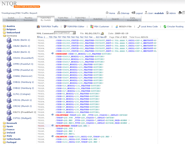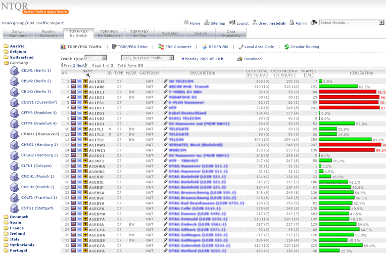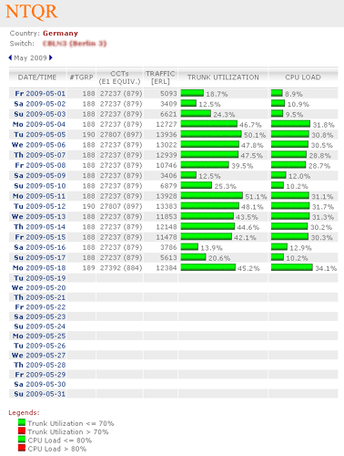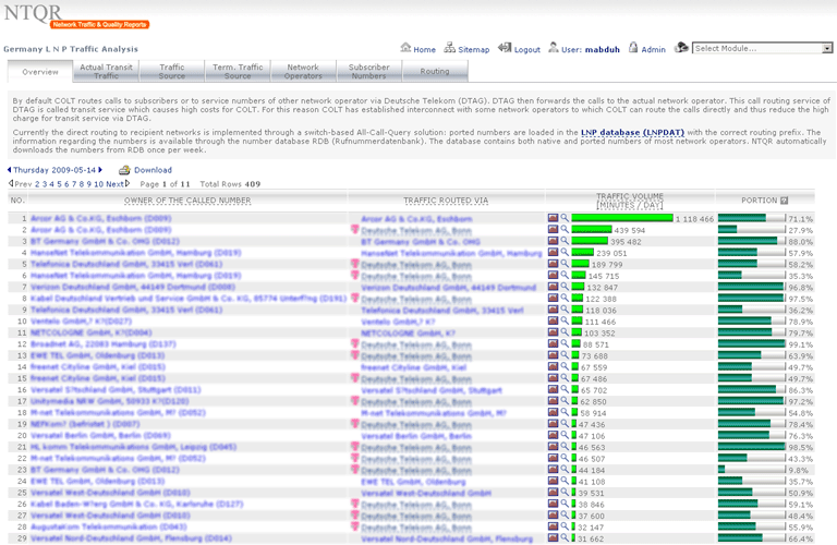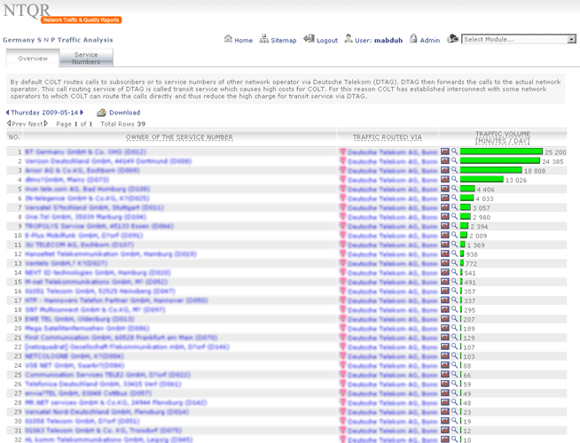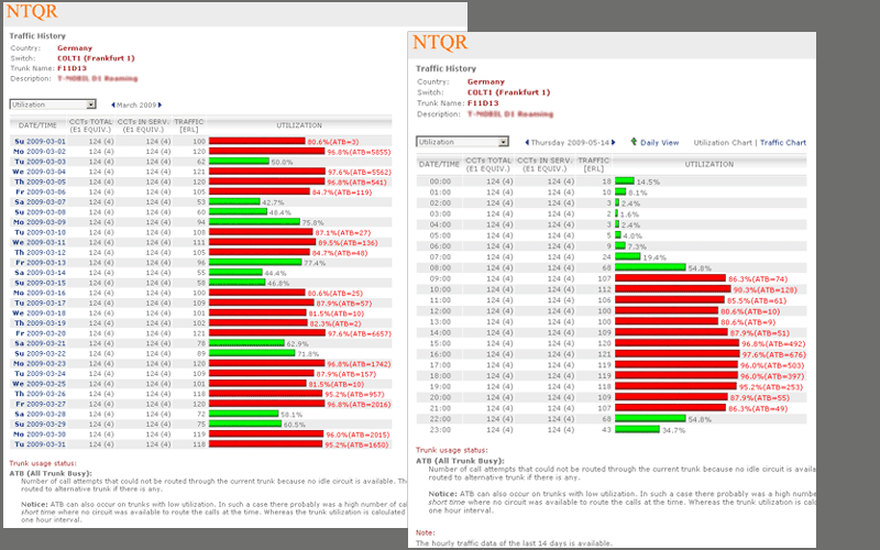 Managing capacity of German voice networks is made easy with NTQR. Based on CDR (Call Detail Record) several reports are generated by NTQR to monitor German voice networks. It includes statistics about traffic distribution by call origination/destination, traffic matrix between switch locations etc. NTQR has been used for designing and dimensioning COLT Interconnect with DTAG based on EBC model.
