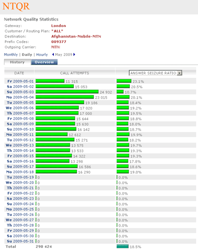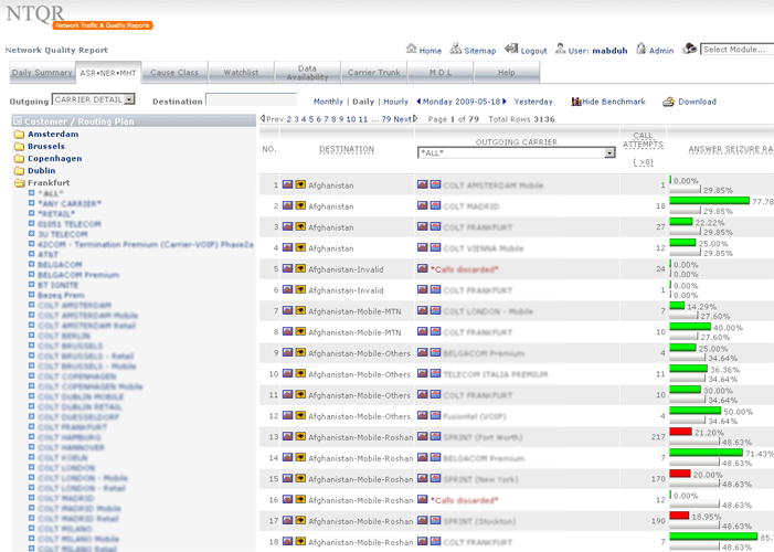 Keep revenue for voice services high and increase customer trust with SLA assurance! NTQR performs real-time monitoring of network quality parameters ASR (Answer Seizure Ratio), NER (Network Effectiveness Ratio) and PDD (Post Dial Delay) per destination and per routing plan e.g. Wholesale, Retail. A real-time alert notification is available for network operation engineer. He is responsible for optimizing call routing in term of voice quality and economy, but also for routing adjustment of calls with low ASR to guarantee SLA's and to reduce revenue loss.