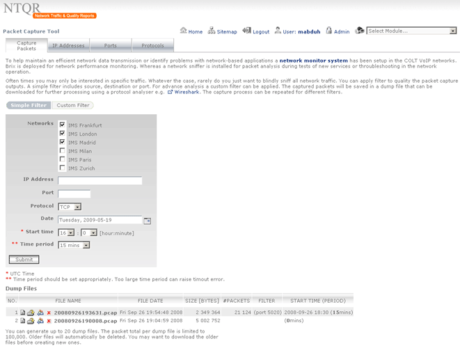To help maintain an efficient network data transmission or identify problems with network-based applications a network monitor system needs to be setup in the VoIP networks. tcpdump is used to collect the IP packets. NTQR provides a web interface from which the user can specify the filter to qualify the IP packets that should be captured. The captured packets will be saved in a dump file that can be downloaded for further processing using a protocol analyzer e.g. Wireshark